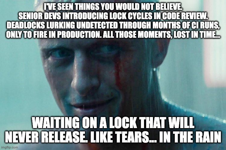 I hate deadlocks. Maybe you do too. Back at Fission, whenever someone would suggest a mutex weβd start a chant of βI say mutex, you say deadlock: Mutex! DEADLOCK! Mutex! DEADLOCK!β. Deadlocks lurk β perfectly invisible in code review, happy to pass CI a thousand times, then lock your system up at 3am under a request pattern that no one anticipated.