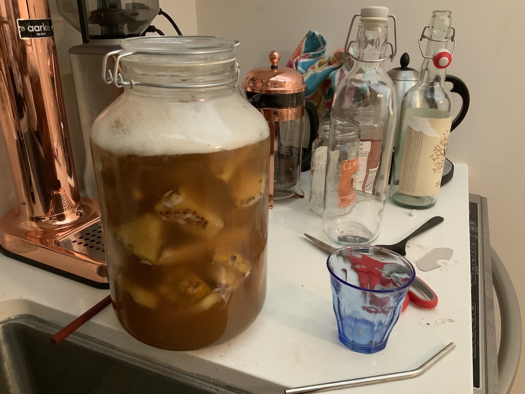 - NOTE: you can add more or less sugar, but more doesn’t necessarily mean sweeter! Remember that fermentation is the conversion of sugar to alcohol. You can get this pretty goddamn boozy if you let it ferment long with lots of sugar (I did this by accident once — delicious but definitely couldn’t walk in a straight line)